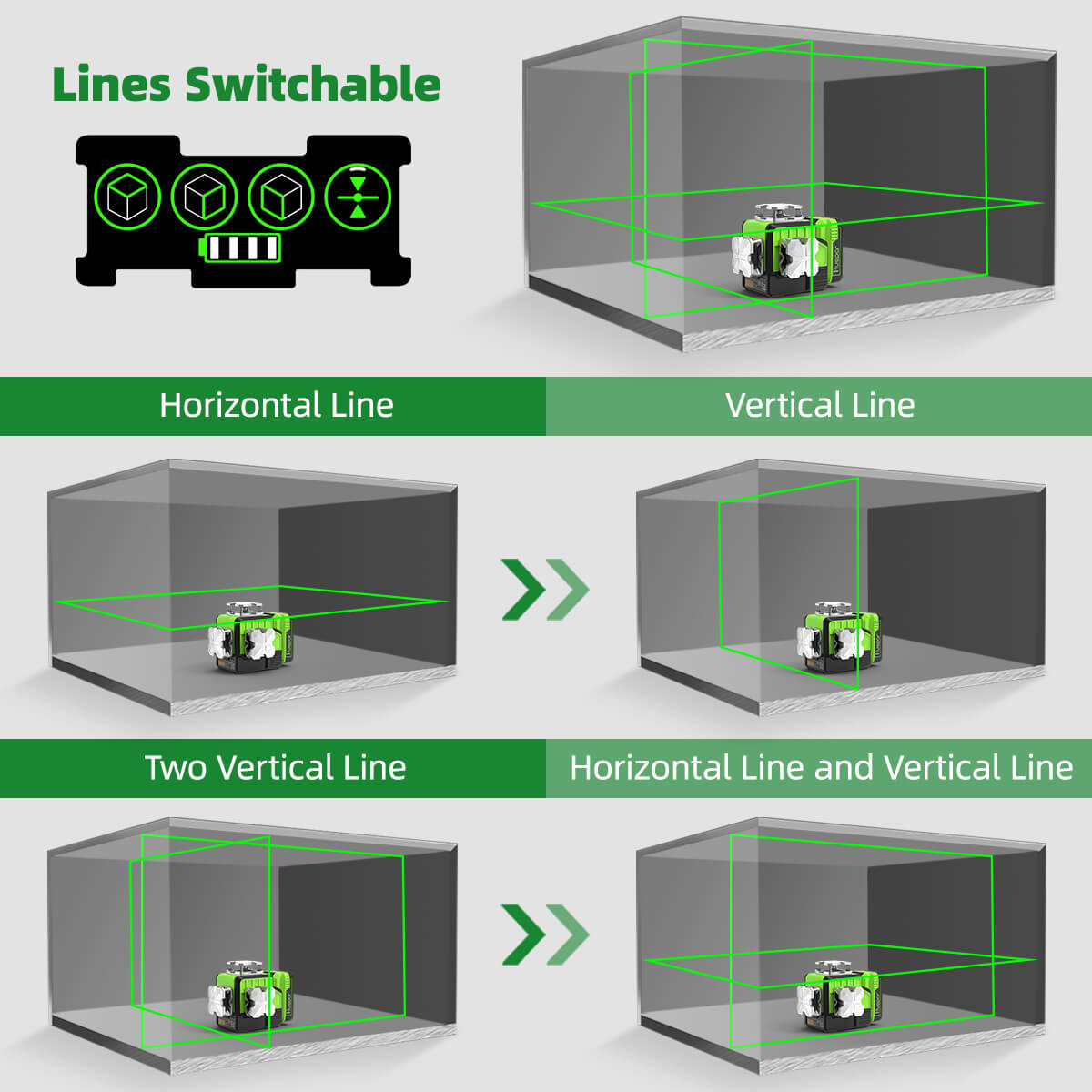 El nivel láser Huepar tiene un plano horizontal de 360 °, dos planos verticales de 360 °, 12 líneas láser, que pueden cubrir el piso, las paredes y el techo alrededor de la habitación. Las líneas horizontales y las líneas verticales se cruzan en ángulos de 90° para ayudarlo a visualizar rápidamente y terminar el diseño cuadrado. Cada botón en este nivel de láser corresponde a una sola línea de láser, puede elegir fácilmente encender/apagar cualquier línea de láser.