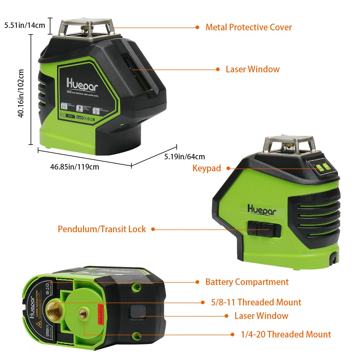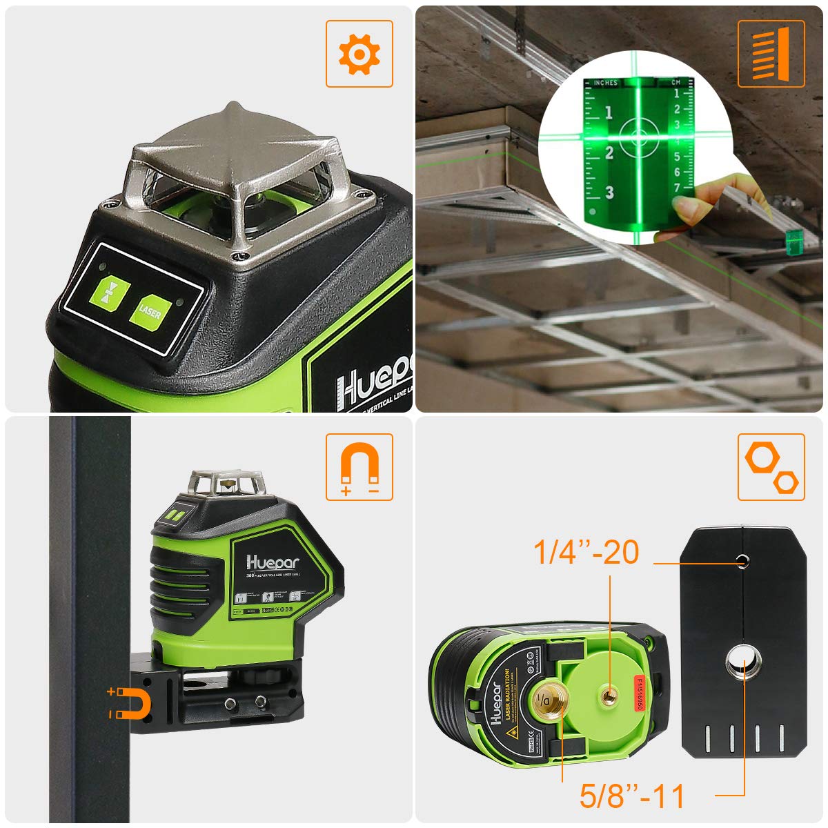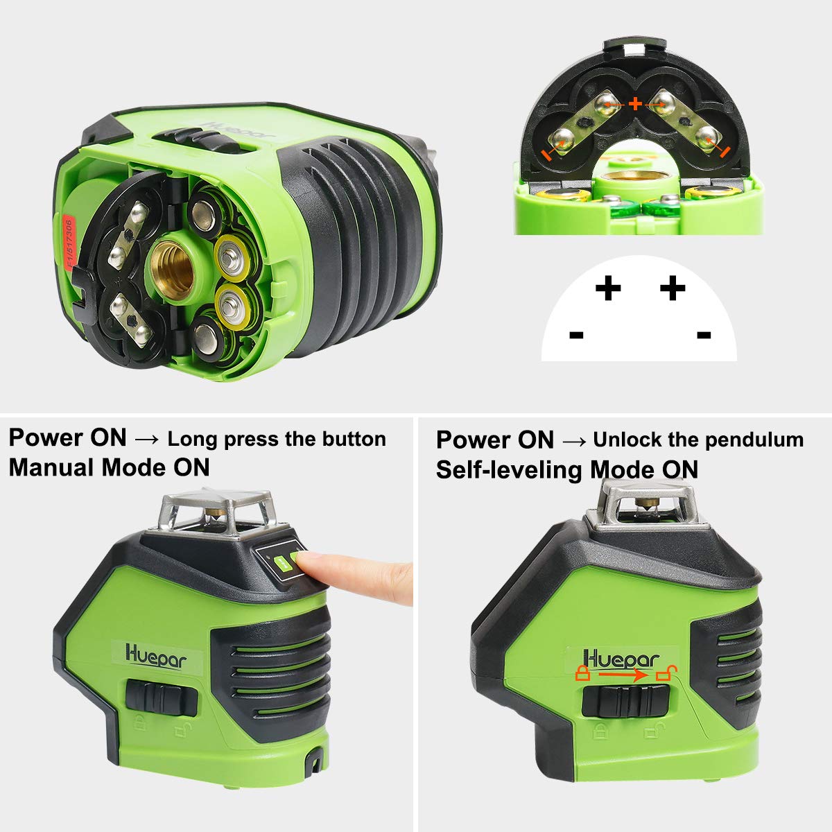 • MODO PULSO EXTERIOR AHORRO DE ENERGÍA: Línea de visibilidad láser hasta 40m en condiciones de trabajo estándar, con una precisión de ±3mm a 10m, ±3mm a 10m para puntos. Además de un haz verde más brillante, un modo de impulso de ahorro de energía extiende el alcance del láser hasta 50m con Huepar Receptor Láser de Línea en condiciones de luz brillante o al aire libre y utilizar durante más tiempo.