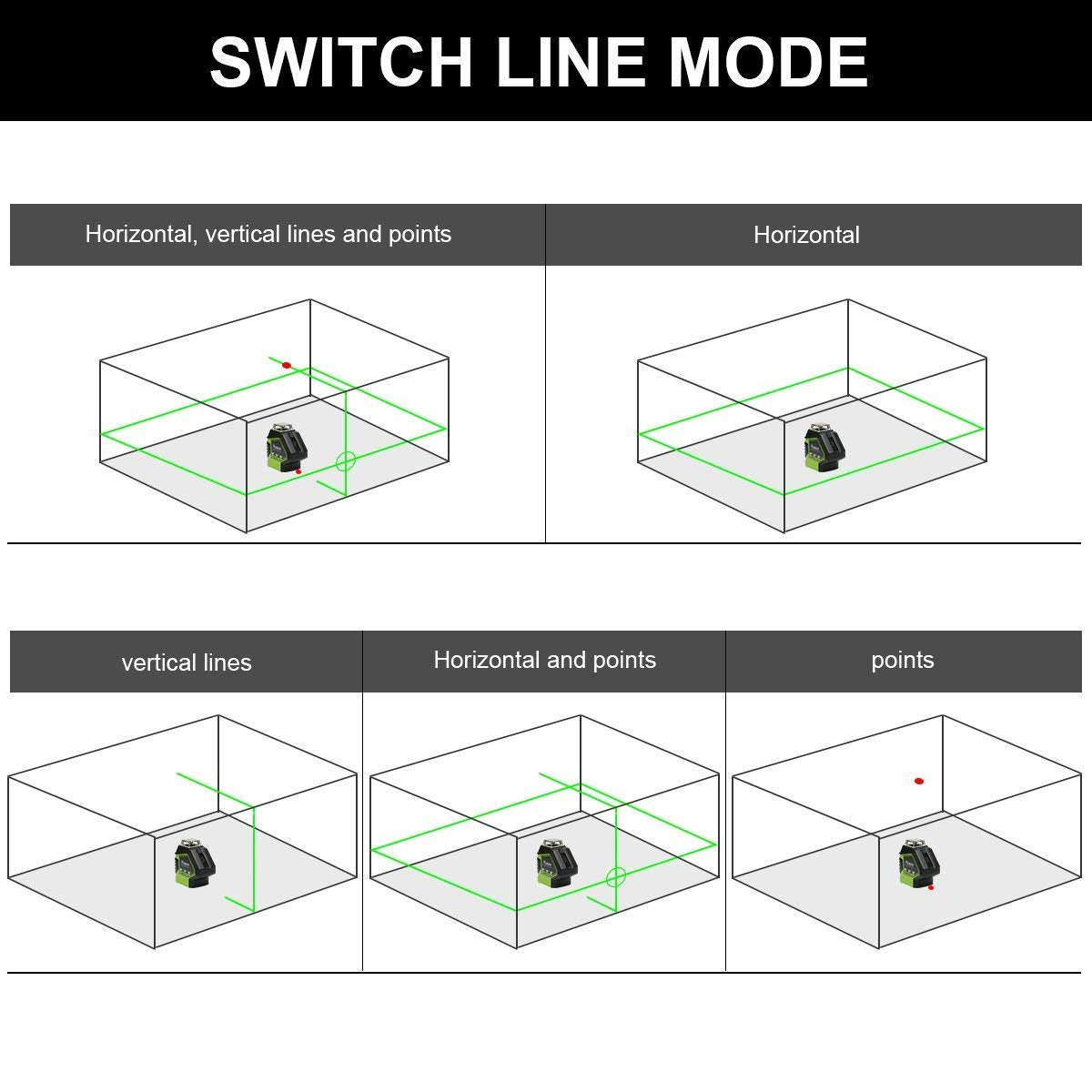 • Nuestro nivel láser tiene una luz horizontal de 360 ° y una luz vertical, que es básicamente adecuado para todas las aplicaciones de decoración de interiores.