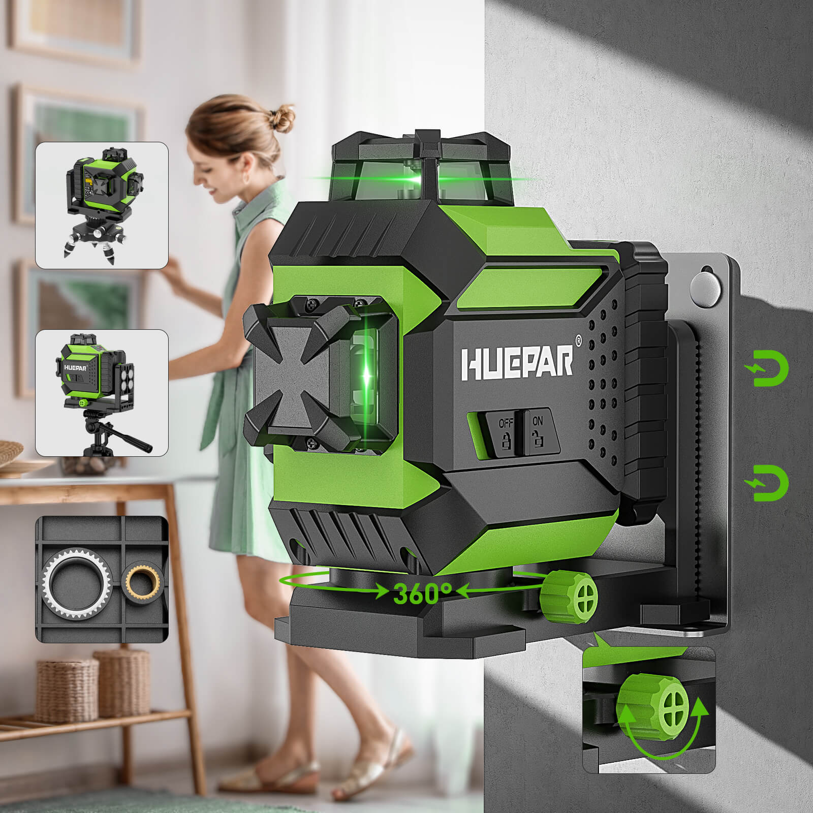 Un plano horizontal de 360° y dos planos verticales de 360° permiten a los usuarios cubrir el suelo, la pared y el techo de toda la habitación. Las tres líneas láser se pueden seleccionar individualmente dependiendo de las aplicaciones del sitio de trabajo, puede elegir fácilmente encender/apagar cualquier línea láser para ayudarlo en sus trabajos de nivelación, brillante y claro. Ideal para pavimentar azulejos, instalar foto, carpintería de puertas, ventanas o muebles, colgar papel pintado, etc.