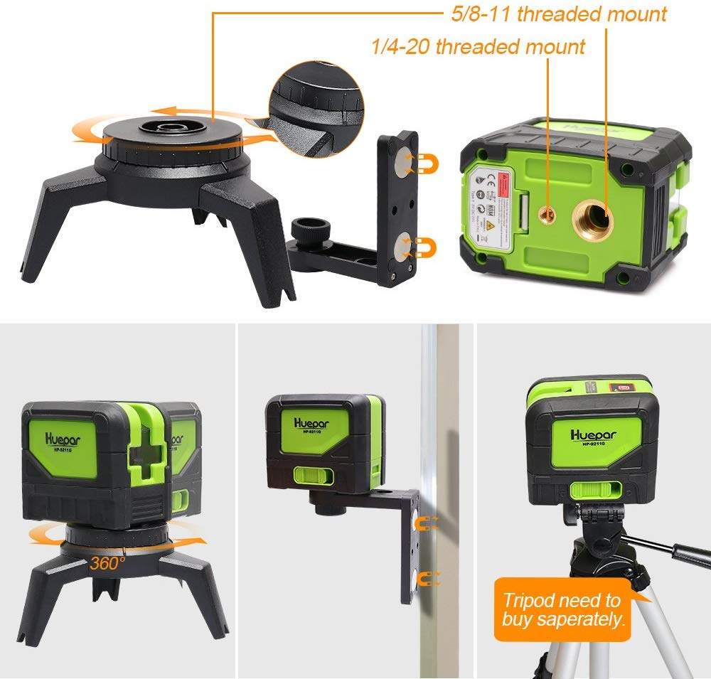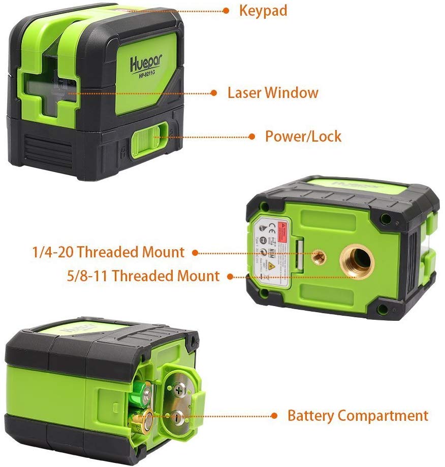 - COMBINACIÓN DE PUNTOS ARRIBA Y ABAJO Y LÍNEAS TRANSVERSALES: El nivel láser autonivelante Huepar 9211G ofrece dos puntos más una línea cruzada para un láser dos en uno. Esta herramienta de punto-línea híbrida del laser combina todas las funciones de una serie Huepar de lasers de la línea y de lasers del punto, lo que proporciona la máxima versatilidad para los usuarios en los comercios y remodelaciones.
