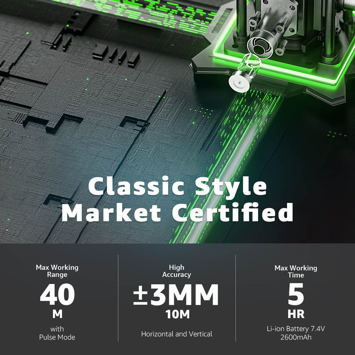 La herramienta láser Huepar S04CG tiene una línea horizontal superior de 360° para instalaciones de techo y una línea horizontal de 360° para baldosas. Su base de elevación permite que el láser de piso se eleve de 1" a 3.54" para proyectar sobre superficies irregulares. Este nivel láser de 4D ofrece cobertura completa para baldosas, piedra, ladrillo, alfombra y suelos de madera. Utilizando la tecnología láser verde de Osram, proporciona mayor visibilidad, mayor rango, mayor estabilidad y mayor eficiencia energética.